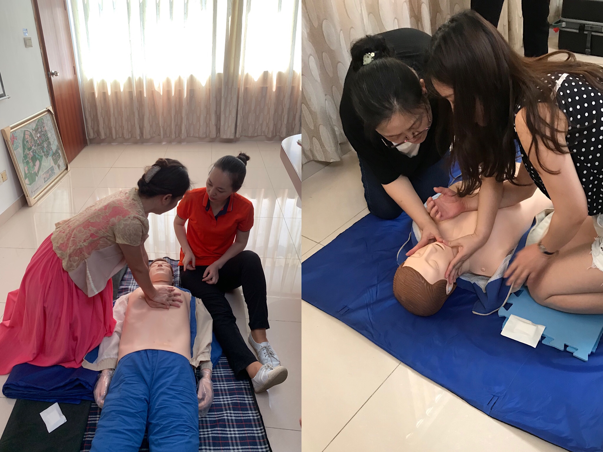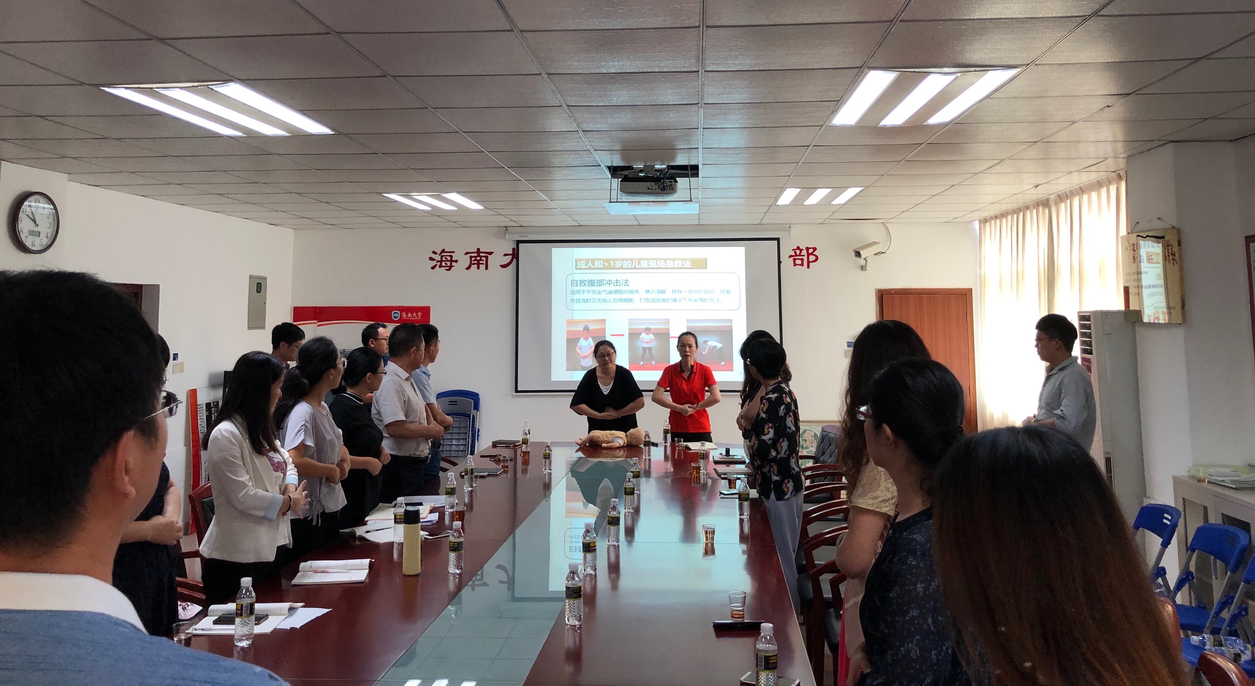 培训师曾美青和廖绍筑先后讲解了心脏复苏的操作方法、AED的使用及气道异物梗塞的救治,并进行了心肺复苏操作演示,将参训人员分成两组逐一指导进行心肺复苏操作练习。