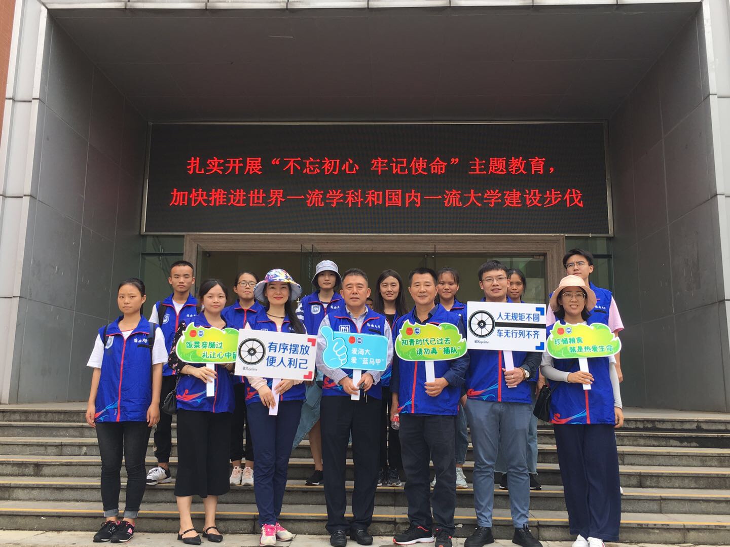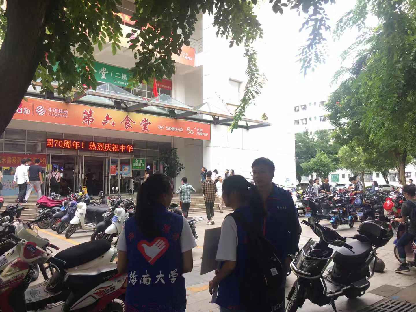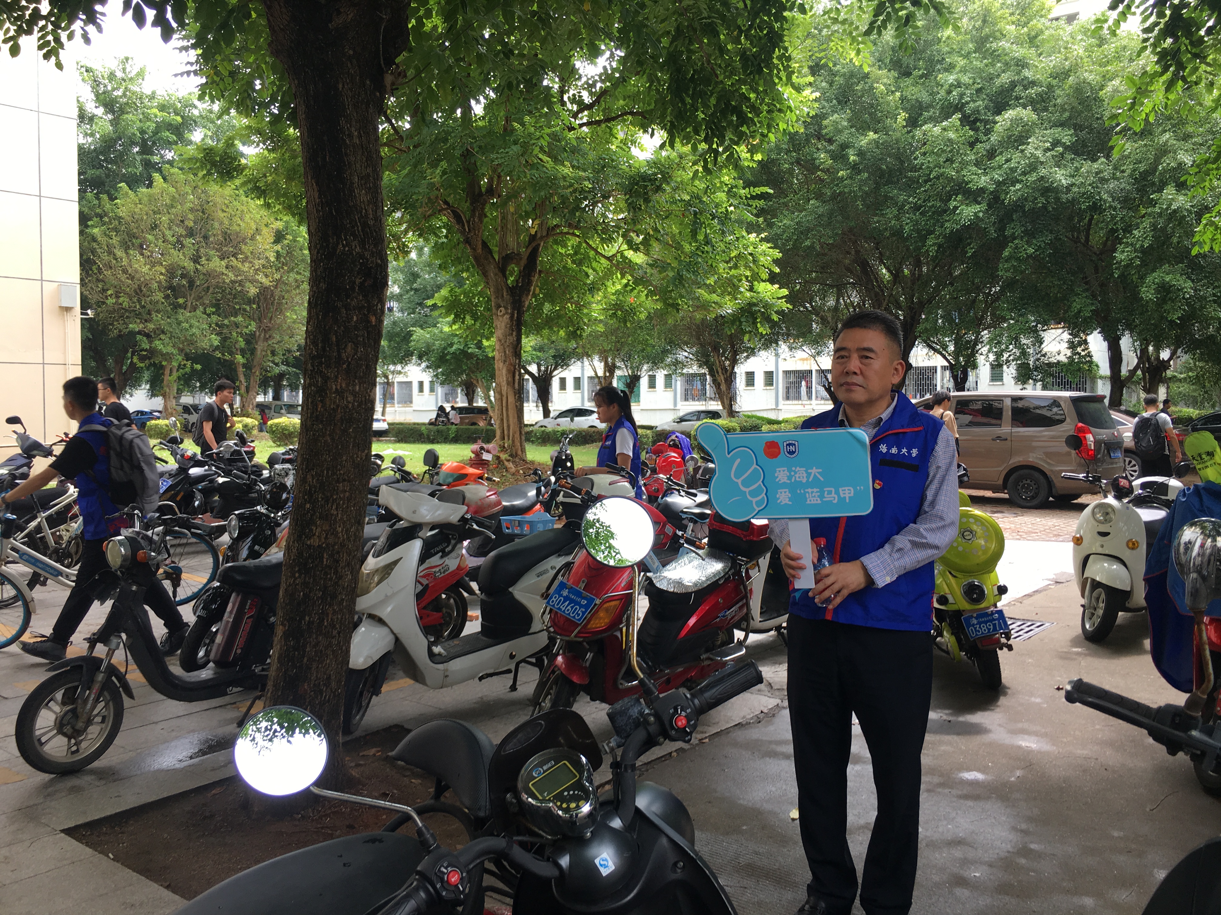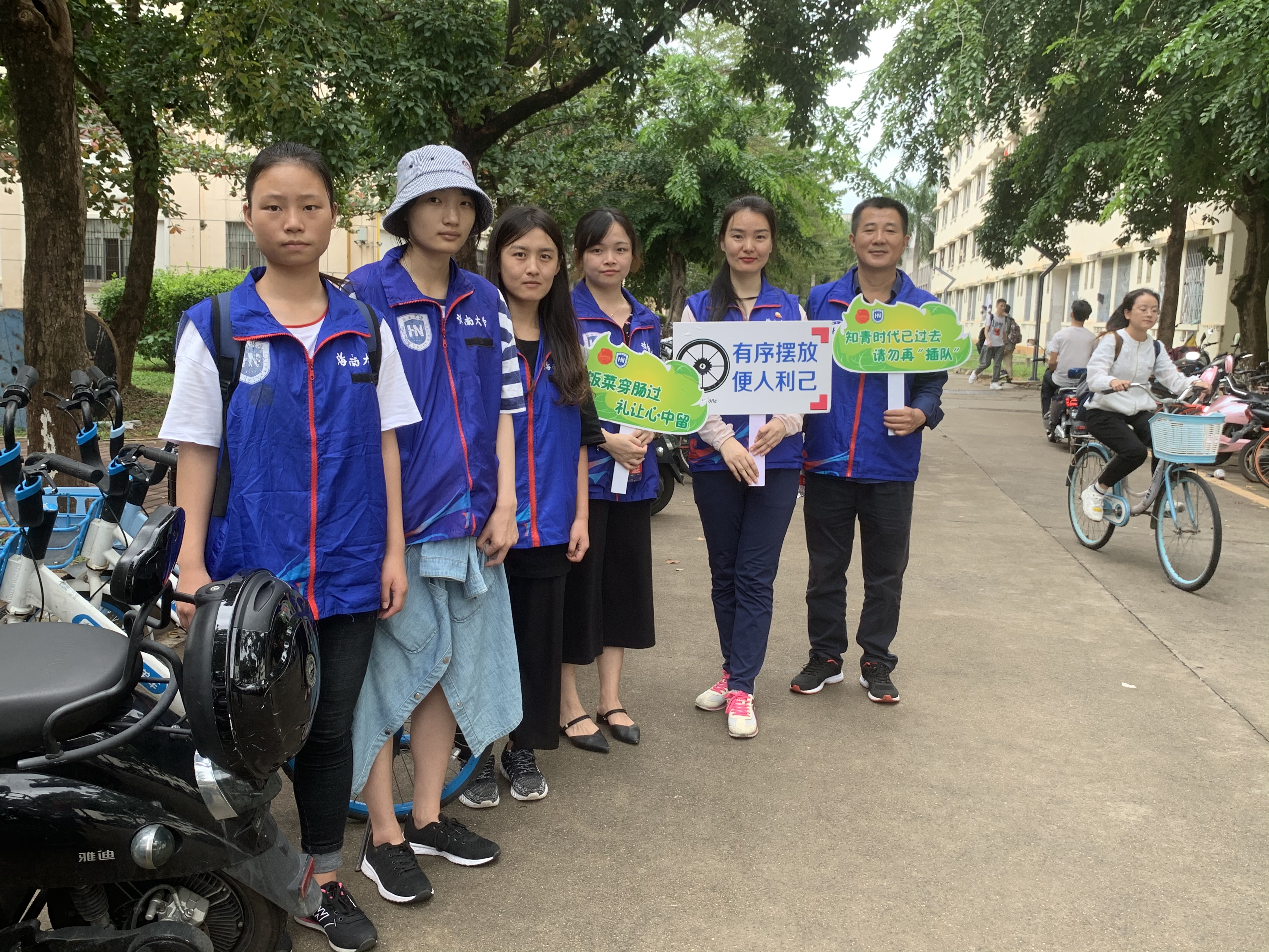 大家身穿蓝色马甲在活动中相互配合,分配成两个队伍在第五、第六食堂门前针对电动车、单车随意临时停放、不按顺位有序停车等一系列不文明的停车行为进行劝阻引导,监督教师、学生规范停车。